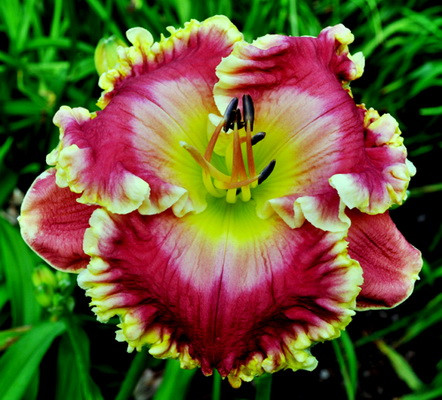 Вишнево-червоний, сріблястий водяний знак і зелене горло. По краю пелюсток розкішна, мереживна, червона облямівка. Квітки виглядають значно крупніше, ймовірно із-за круглої форми квітки і широких перекриваються пелюсток. На кожному квітконосі 35 бутонів. Ароматний.
