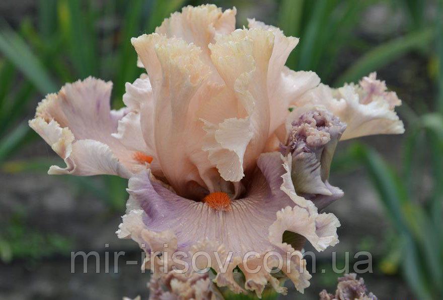 Ірис хвилястий, гофрований. Стандарти темно-пшеничного кольору, фоли – розмито-рожеві з ванільним краєм і білими розводами біля борідки. Сама борідка пухнаста, мандаринова